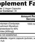 Ingredients: Organic Cordyceps (Cordyceps Sinensis), Mushroom Mycelium Powder (Standardized to 40% polysaccharides [400mg]), Organic capsule (pullulan, water), organic rice hull.*